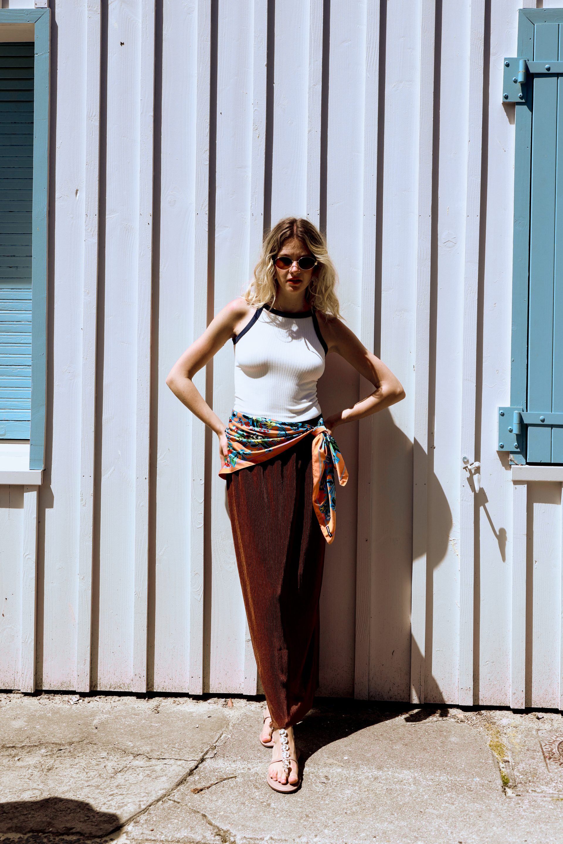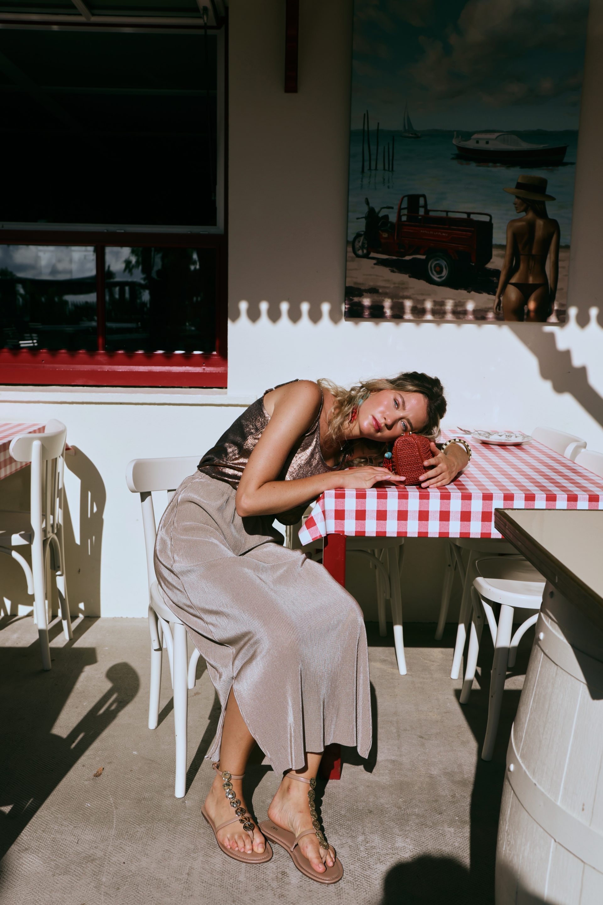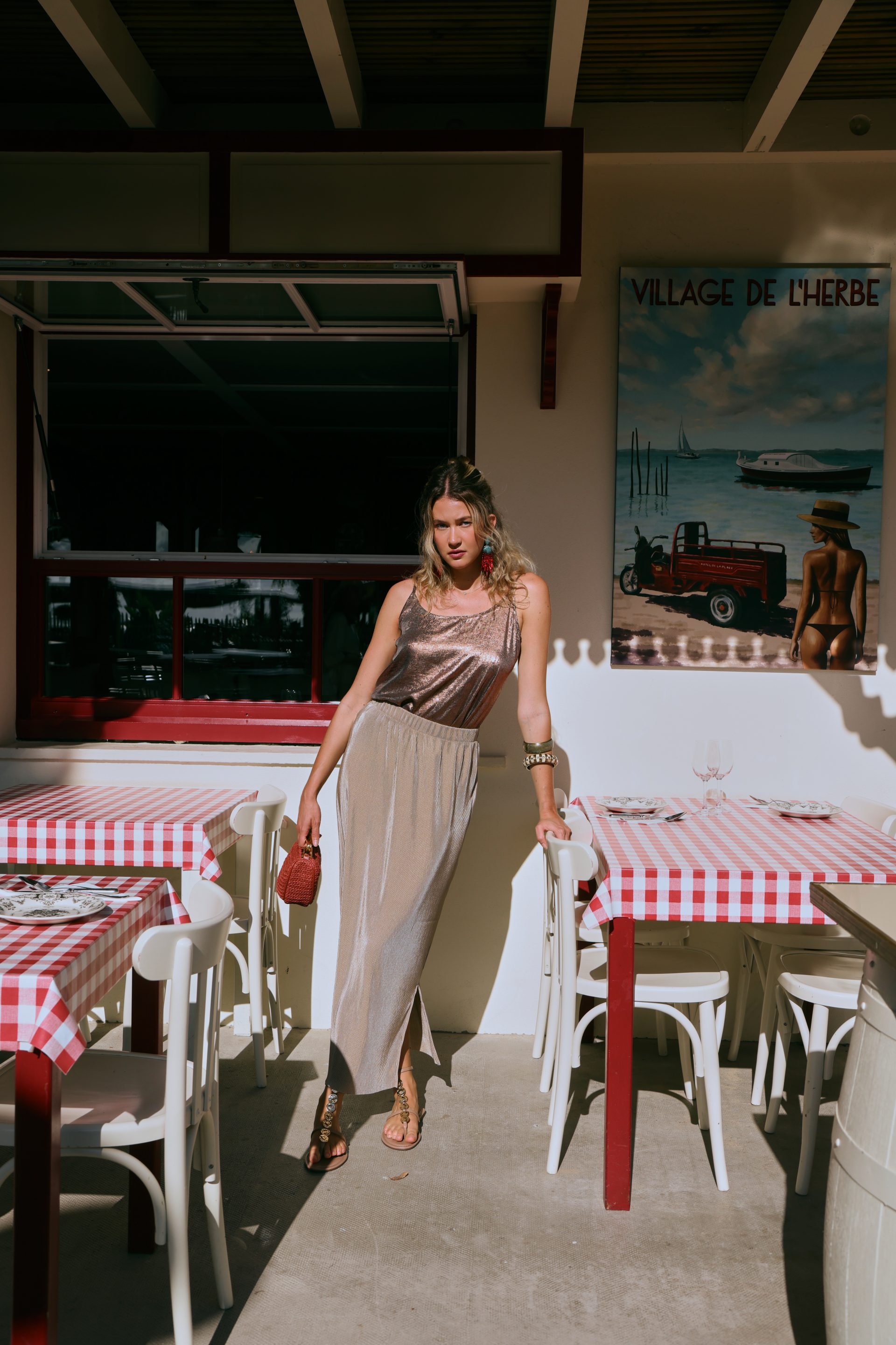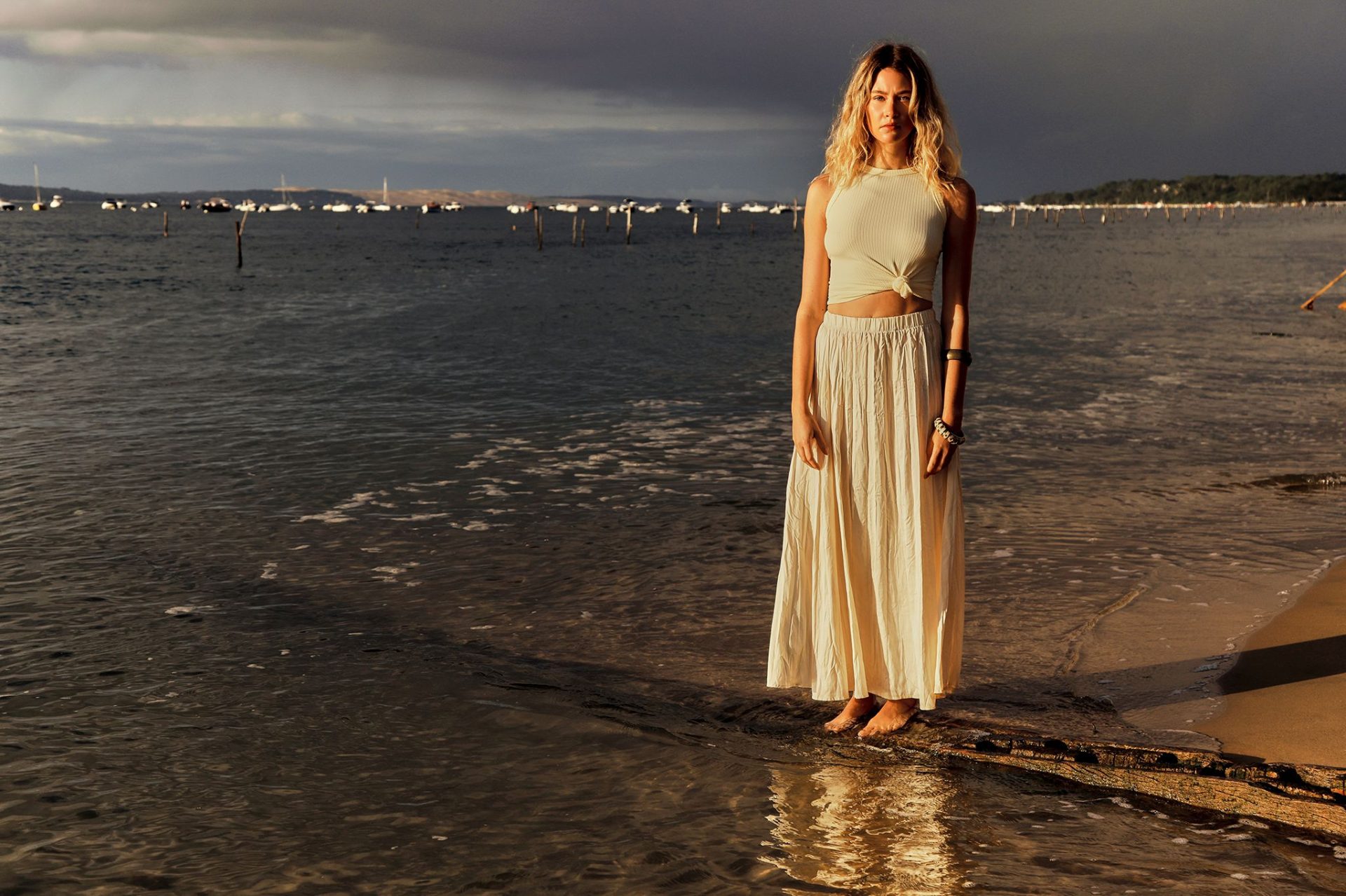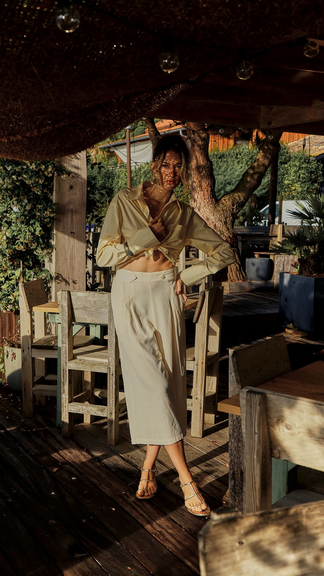 The collection was inspired by the coastal atmosphere. Natural light, neutral tones, fluid movement, and effortless elegance. Flowing dresses captured the rhythm of the ocean breeze. Pleated midi skirts and wide leg trousers balanced structure with softness. Minimal strap tops embraced sunlit days, while polyamide pieces with subtle lurex added a quiet, modern glow.