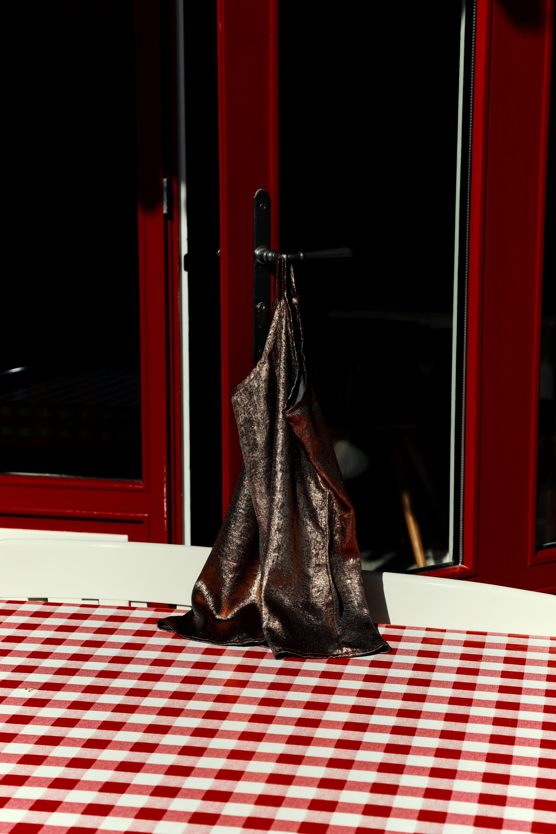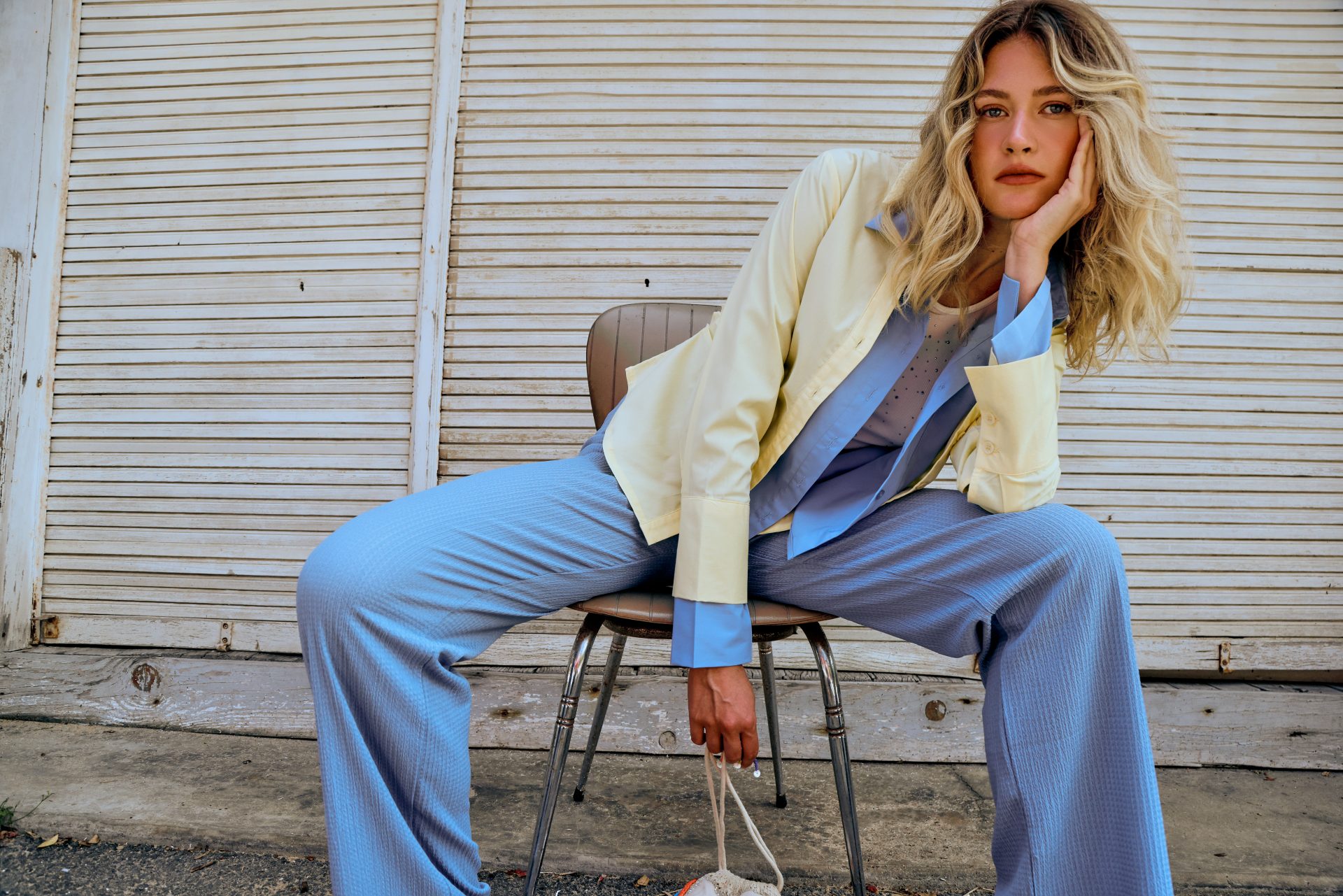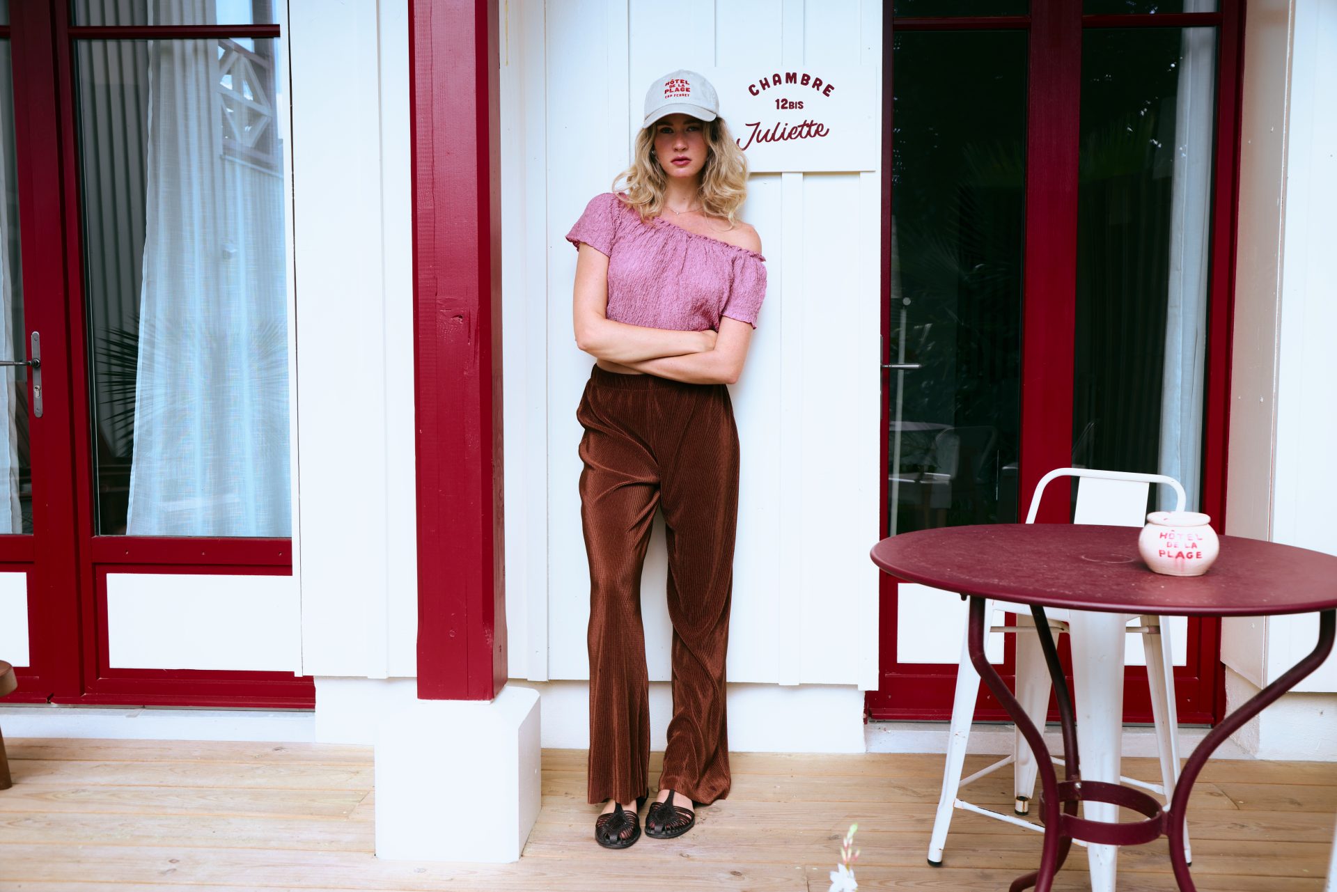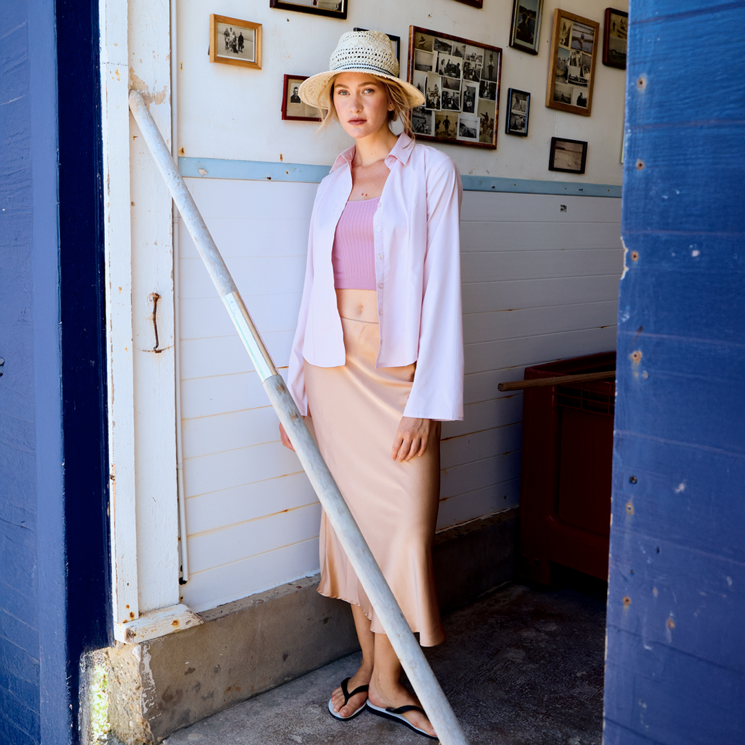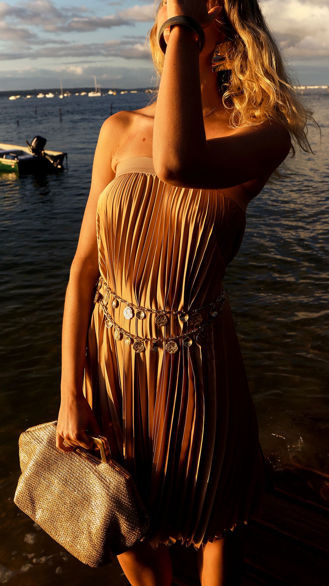 The collection was inspired by the coastal atmosphere. Natural light, neutral tones, fluid movement, and effortless elegance. Flowing dresses captured the rhythm of the ocean breeze. Pleated midi skirts and wide leg trousers balanced structure with softness. Minimal strap tops embraced sunlit days, while polyamide pieces with subtle lurex added a quiet, modern glow.